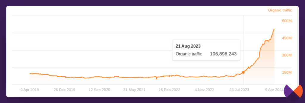 However, there might be more to the story than just the fact that Reddit threads tend to better meet user’s search intent. This article from Marie Haynes Consulting, an SEO Consulting firm, speculates that the increase in the number of Reddit threads appearing in the SERP has to do with recent Google updates and efforts to train Gemini on how humans talk about different topics. As seen in the screenshot below, organic traffic for Reddit started significantly increasing in August of 2023, right around the time of a Google update. Gemini was then officially launched to the public in December of 2023.