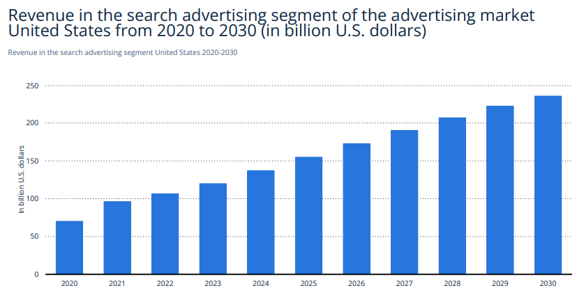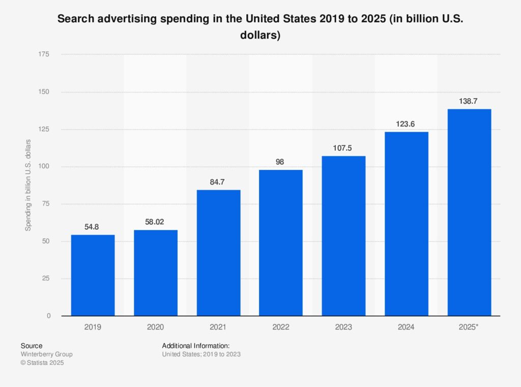 Search advertising, and paid search are not types of organic SEO, but I still think that they are relevant topics to explore for the sake of this blog post. This graph from Statista shows the Search advertising spending in the United States 2019 to 2025.