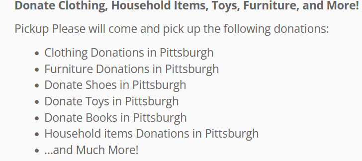 The first website that used black hat practices was pickupplease.org an arm of Vietnam Veterans of America the site used some basic but somewhat subtle keyword stuffing tactics for example they used many common keywords associated with searches for donation see the attached image for more details. But here is a good example “Pickup Please will come and pick up the following donations:.. Household items Donations in Pittsburgh”. Clearly the intent for this list to not be human readable content but a list of “relevant” keywords for the crawler bot. What I find odd is that they were able to rank with this relatively obvious black hat effort. Ranking 5th for “Clothing Drop Off”.